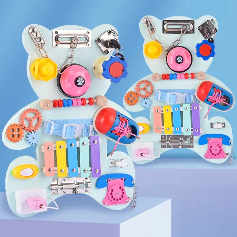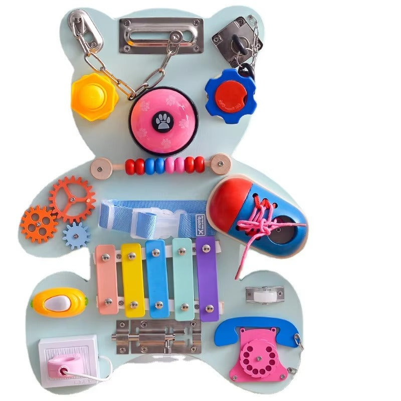 Dual Function: Educational & Stress Relief: Designed to both educate and relieve stress, the board features interactive elements (e.g., latches, knobs, switches, or puzzles) that engage children’s attention. Manipulating these components helps develop focus, fine motor skills, and problem-solving abilities while providing a calming, hands-on activity.