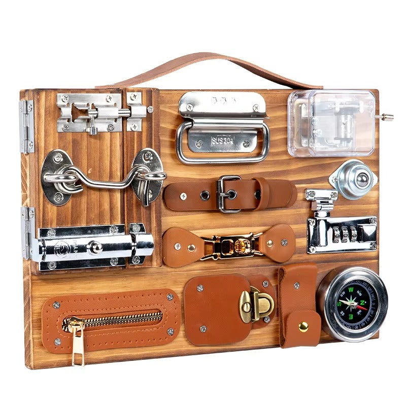 Compass-Themed Fidget Activity: This busy board features a unique "fidgety compass" design, combining interactive elements with a focus on directional and motor skill challenges. The compass theme adds an engaging twist, encouraging children to explore movement, angles, and spatial relationships through play.