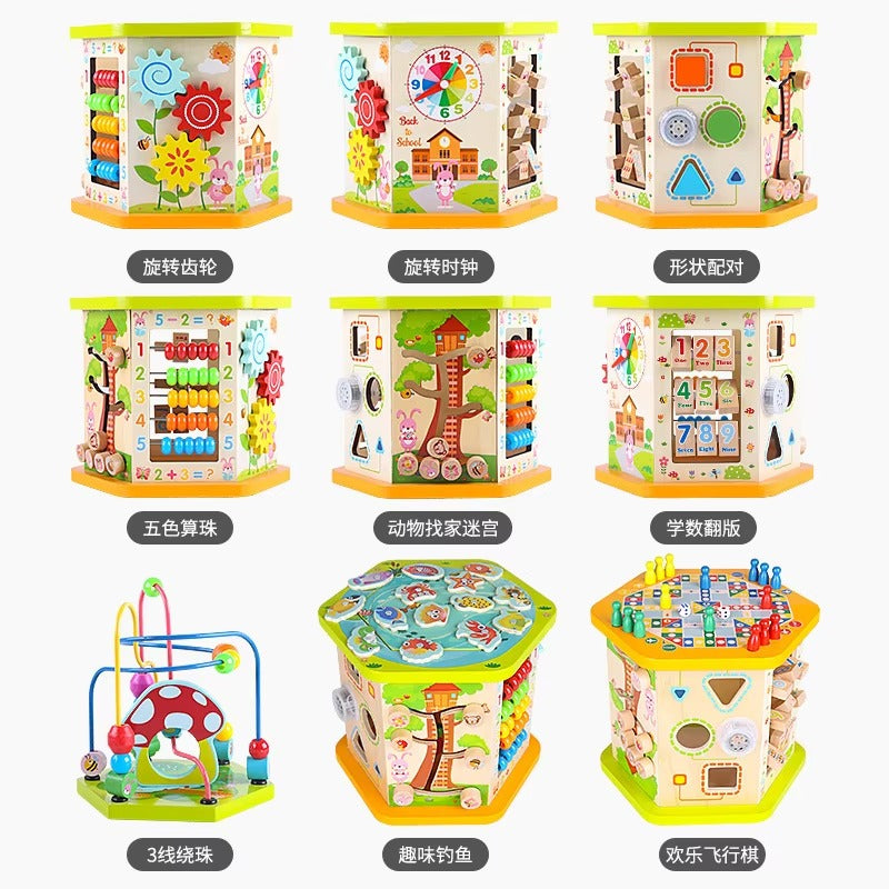 Multi-Functional Busy Cube Design: This Montessori toy features a multi-functional busy cube box, integrating various interactive elements (e.g., latches, gears, bead mazes, or puzzles) into one compact set. The diverse activities ensure children can engage in different types of play, supporting holistic development.