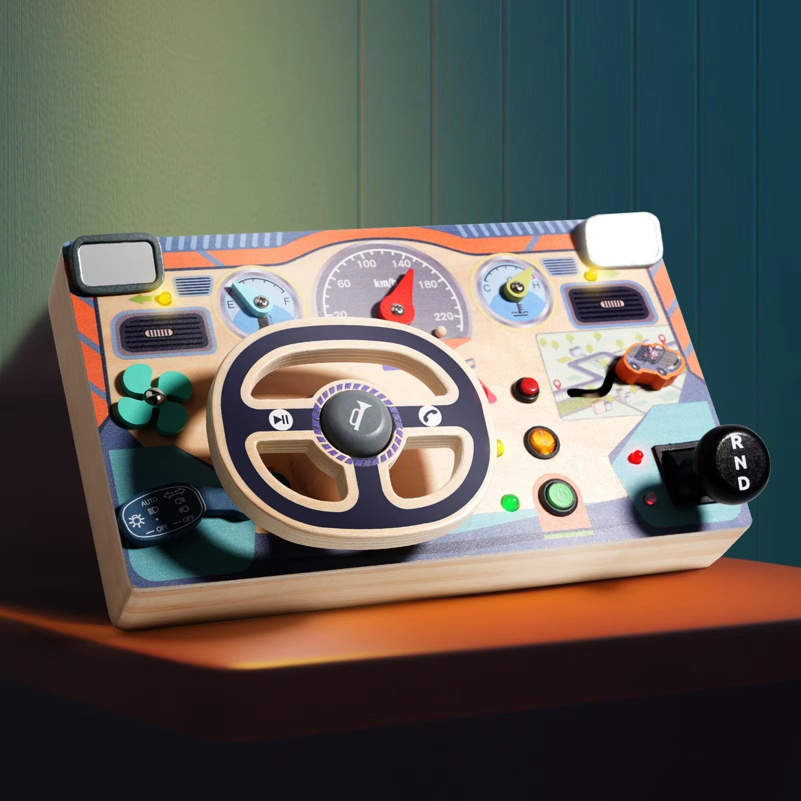 Steering Wheel & LED Light Design: This sensory busy board features a wooden steering wheel paired with LED light switches, creating an interactive pretend-play experience. Children can "drive" and manipulate the switches to activate lights, blending imaginative role-play with hands-on skill development.